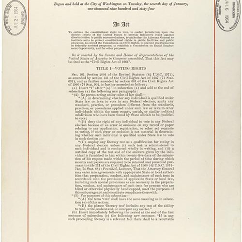 A formal legislative record of Public Law 88-352, enacted to outlaw discrimination based on race, color, religion, sex, or national origin and to…