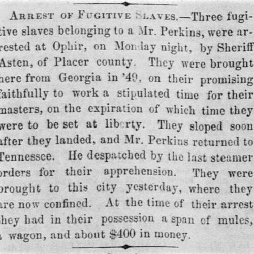 Newspaper article about 3 African Americans arrested for being fugitive slaves in California.