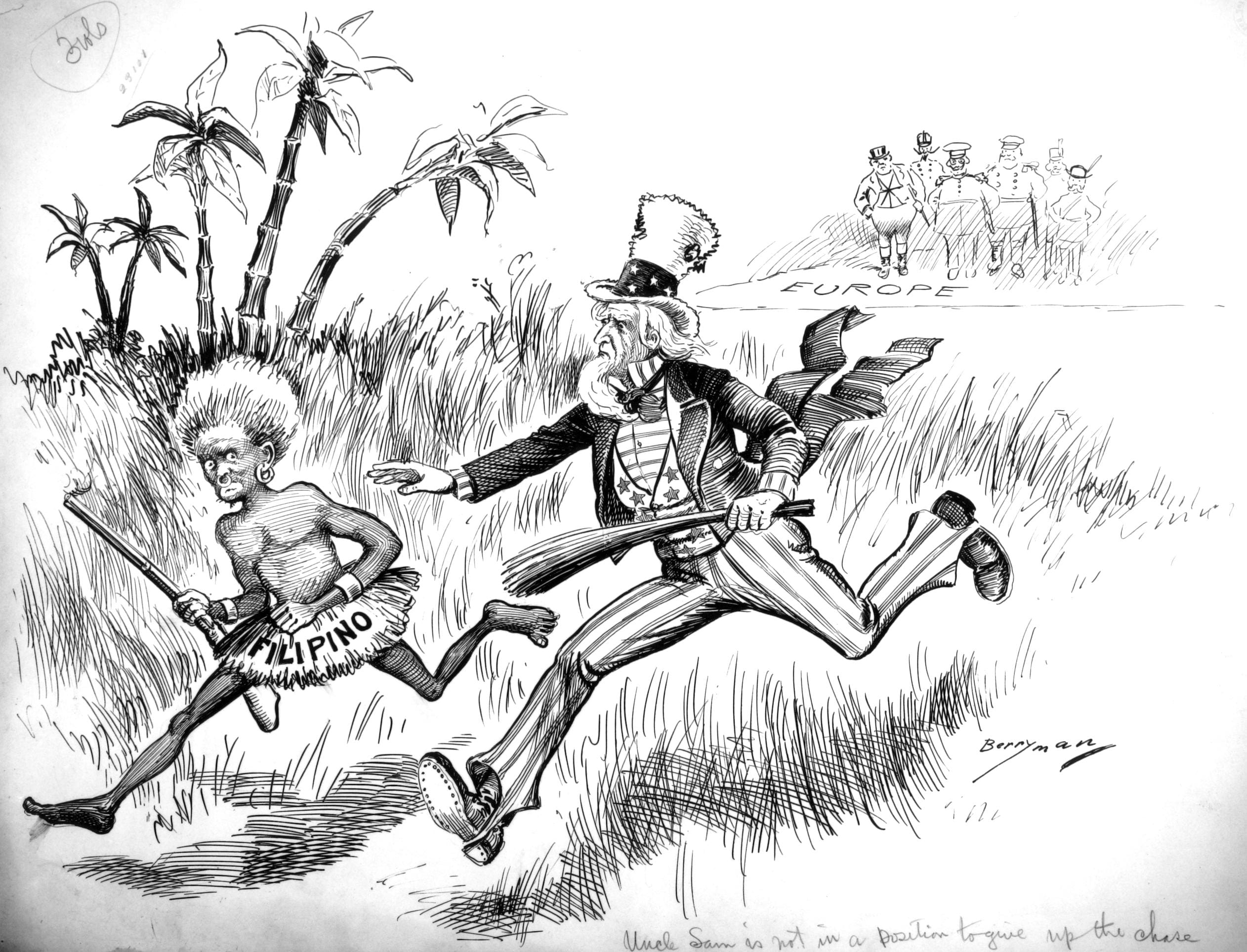 This image create in 1899 depicts Uncle Sam chasing a Filipino native while Europe watches in the back.