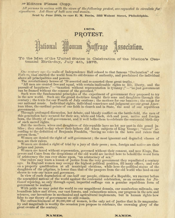 1876 Protest: To the Men of the United States in Celebration of the Nation's Centennial Birthday, July 4th, 1876 [flyer], in Women's Suffrage and Equal Rights Collection, Ella Strong Denison Library, Claremont, California.