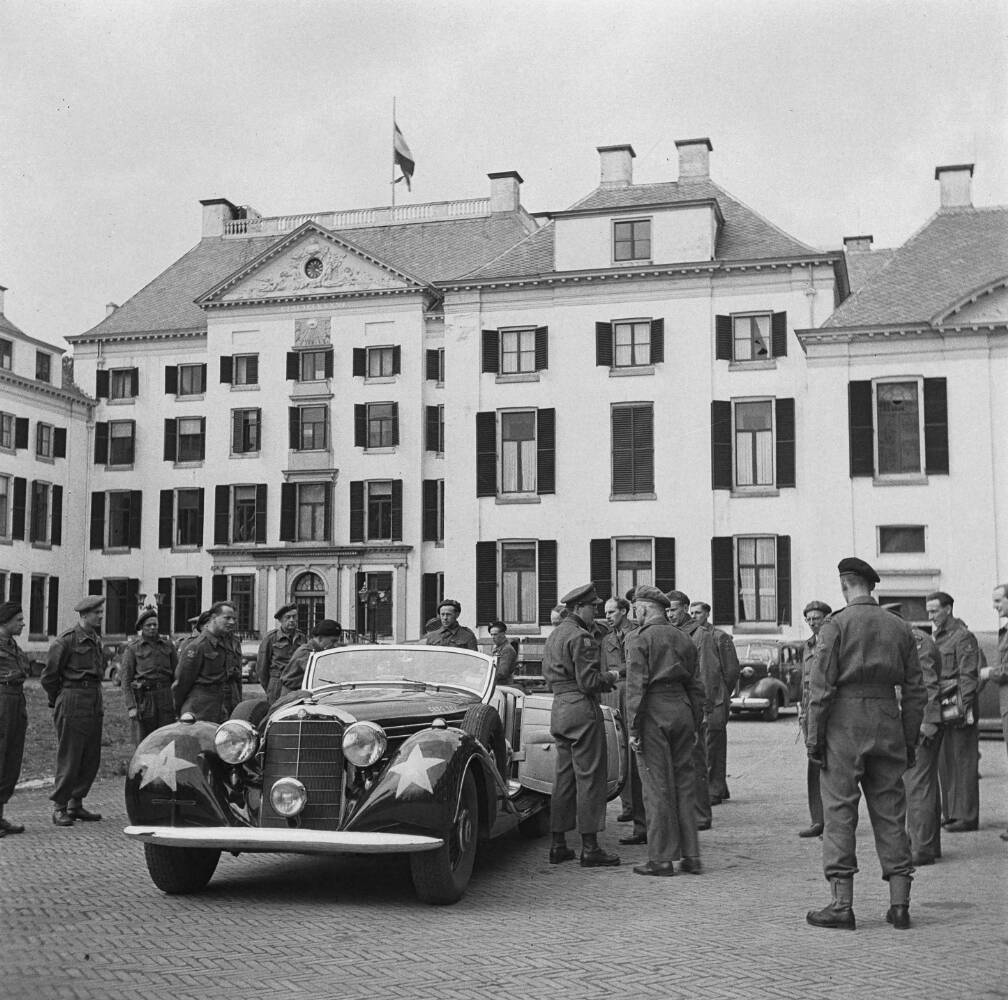 prins Bernard right after stepping into a car that was captured from the Germans at Seyss-Inquart