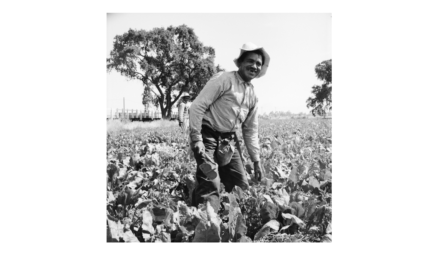Scope/Content: A Bracero (a Mexican national brought in for farm work) in a sugar beet field near Modesto. He uses a short-handled hoe which requires stooping over all day to weed the beets.