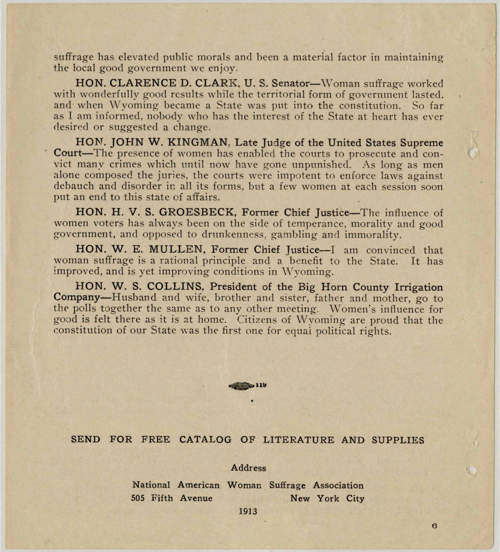 NAWSA leaflet with text from the Wyoming legislature's resolution endorsing women's suffrage and pro-suffrage testimonies from prominent state politicians and public figures. Wyoming was the first state in the U.S. to give women the vote.